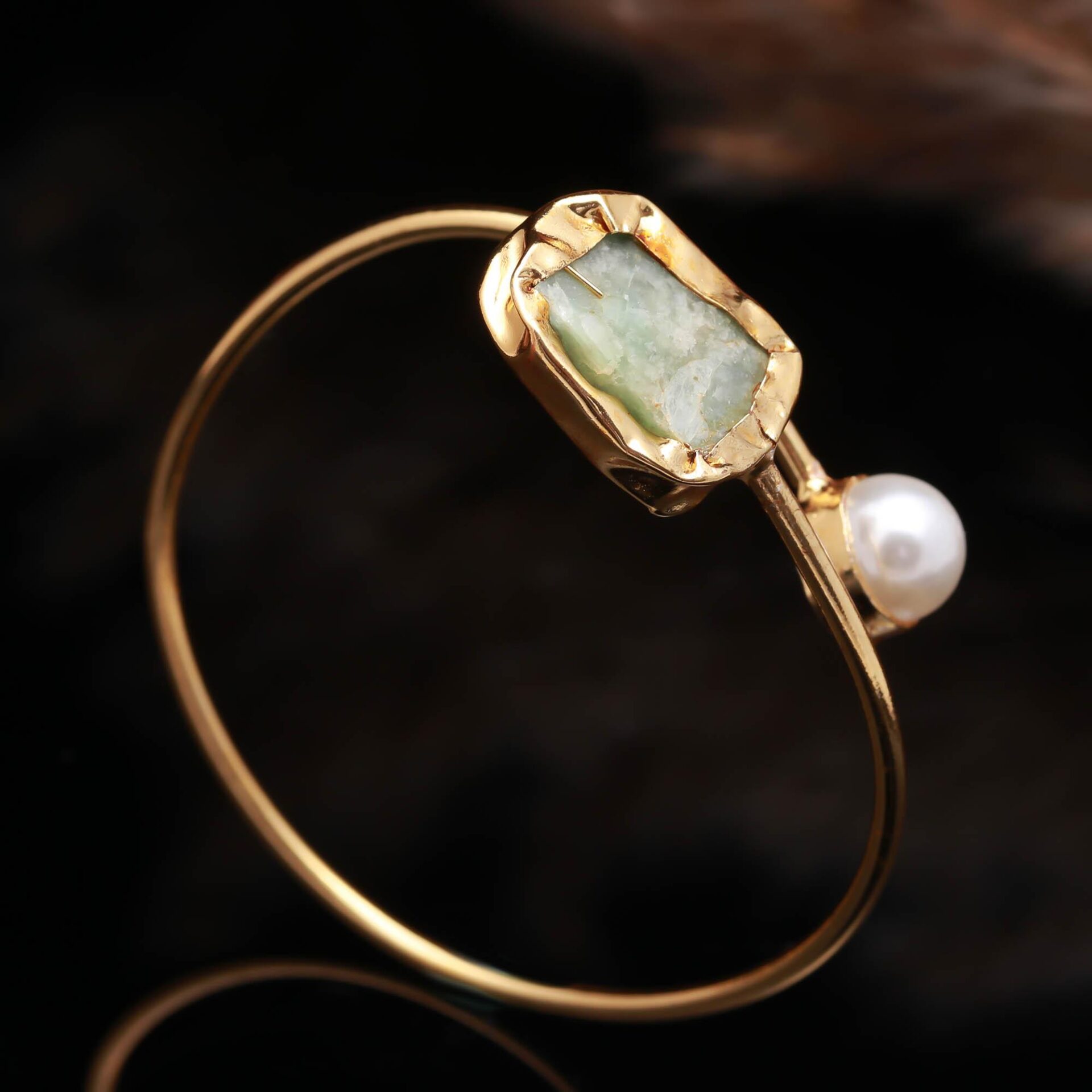 Embody modern bohemian elegance with the ‘GAIA’ open cuff bracelet. This piece perfectly balances raw, natural beauty with sophisticated minimalist design. The polished gold-toned cuff features a striking asymmetrical setting: