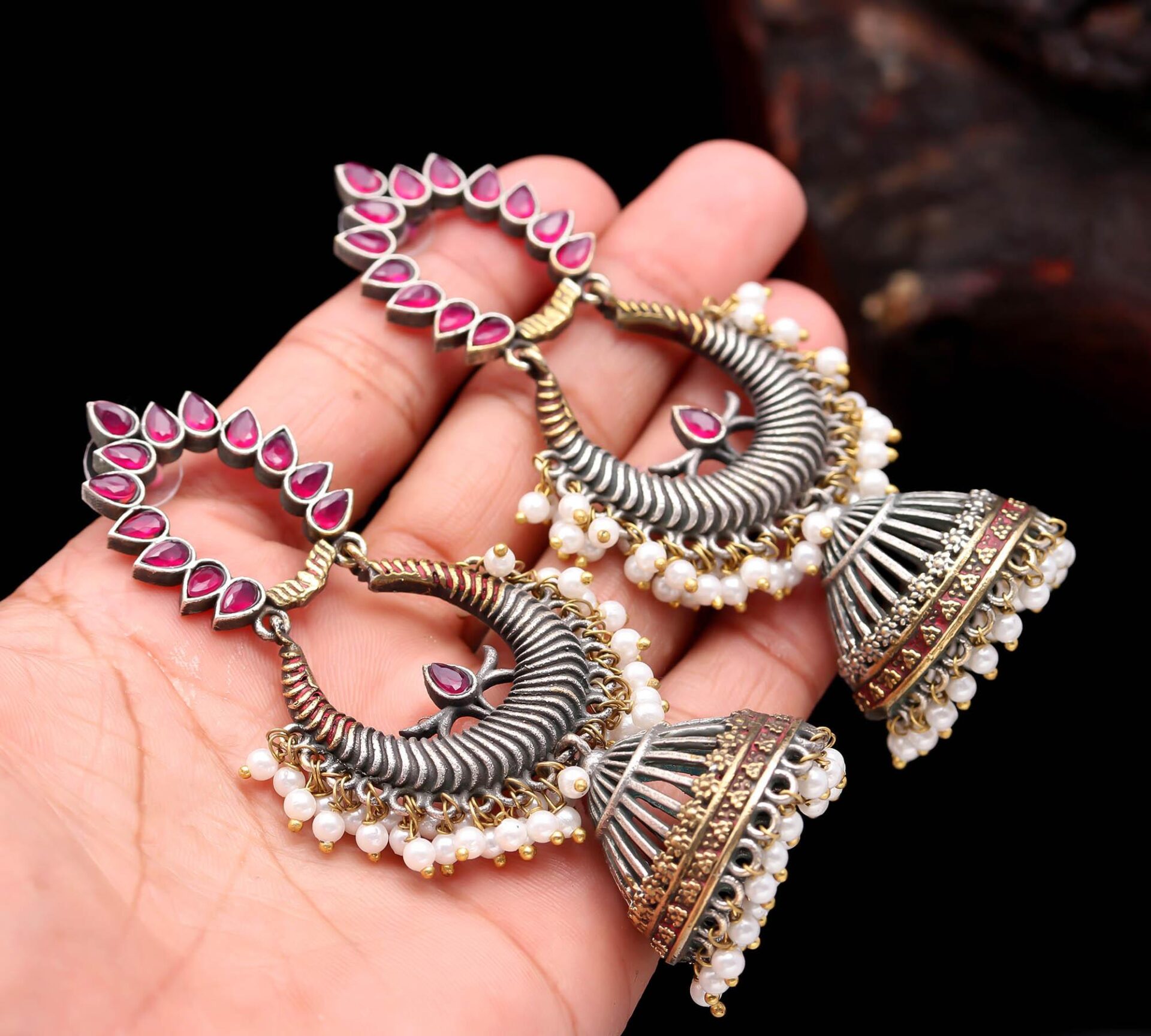 These exquisite Iqra earrings are a striking example of dual-tone fusion jewelry, blending the dark charm of oxidised silver with rich, vibrant stones.