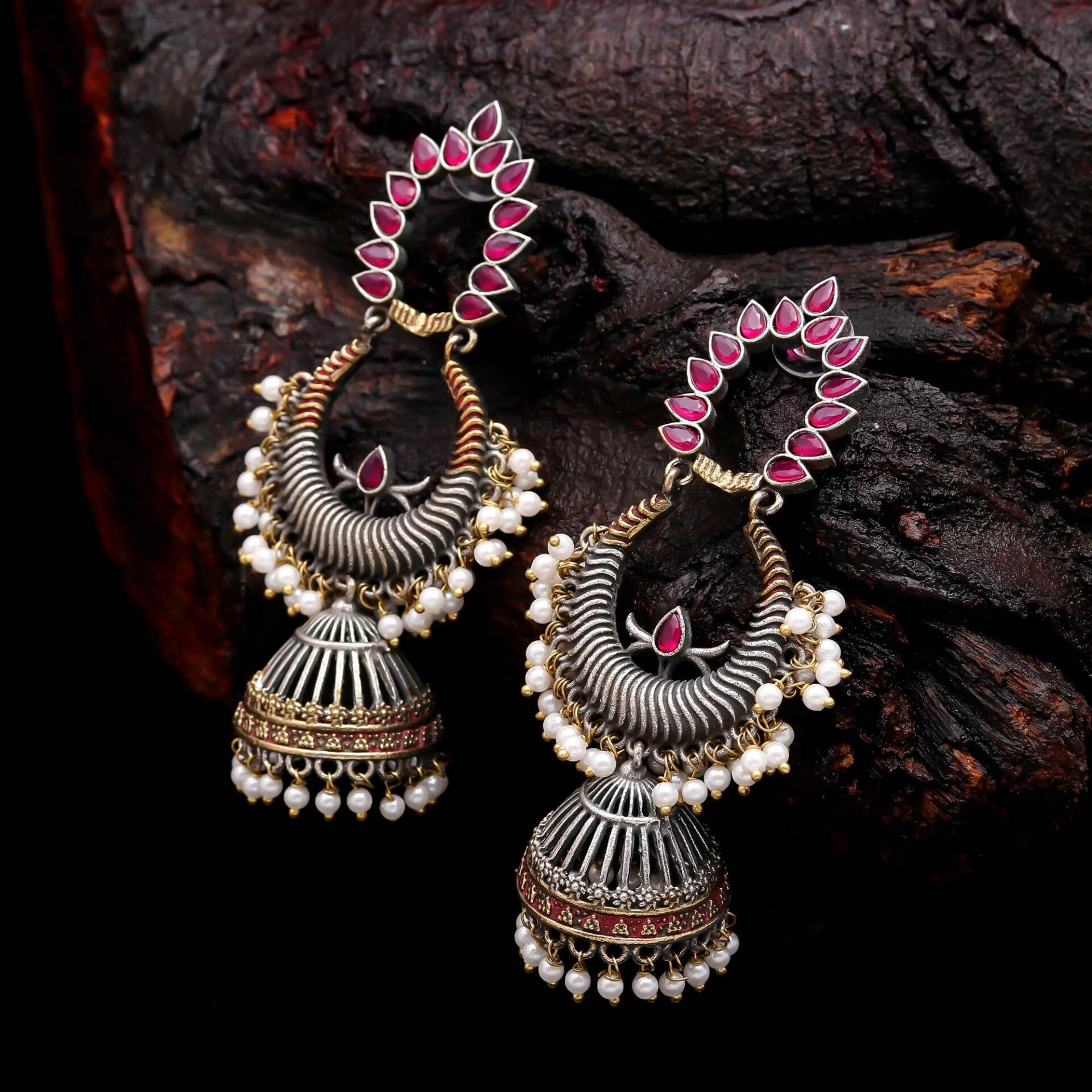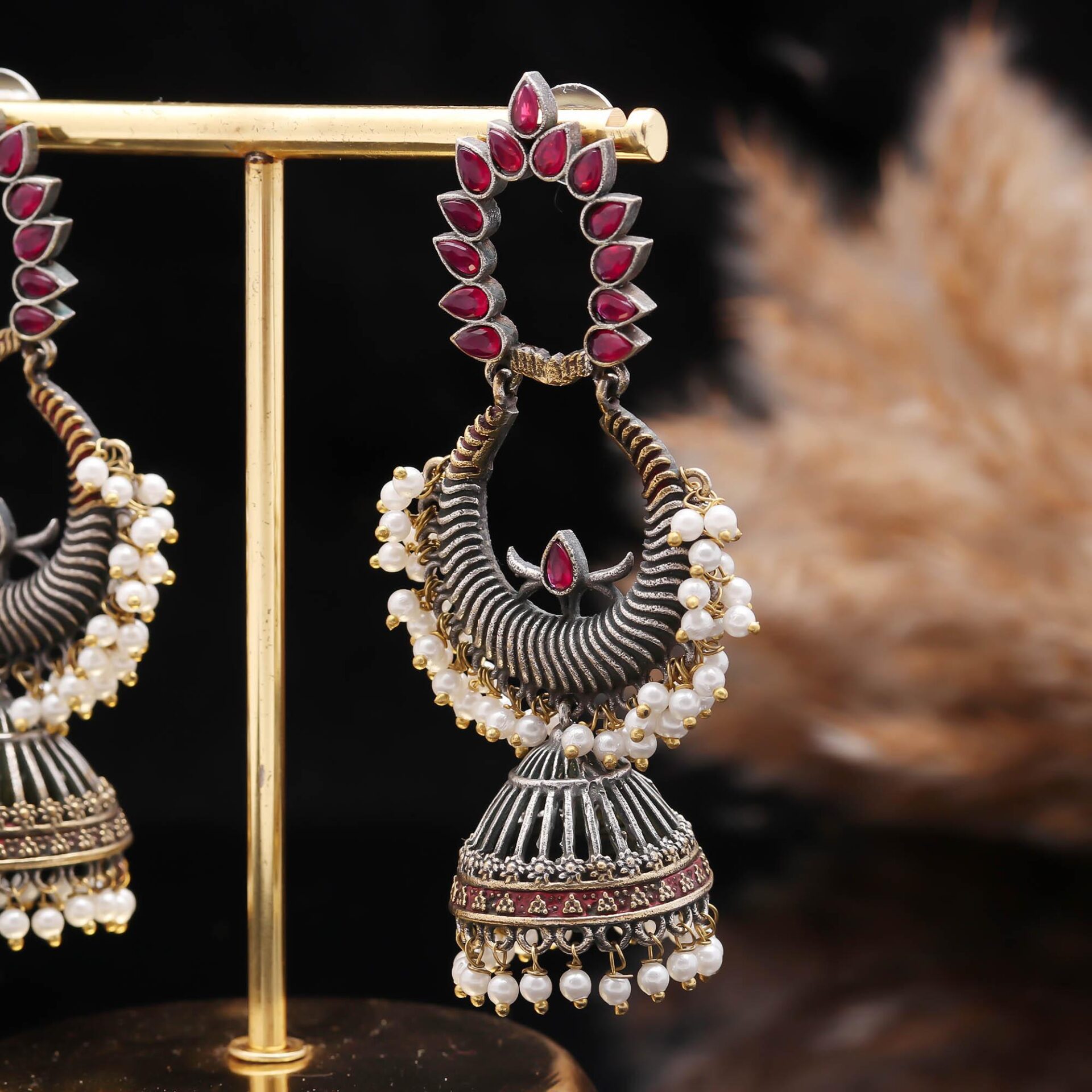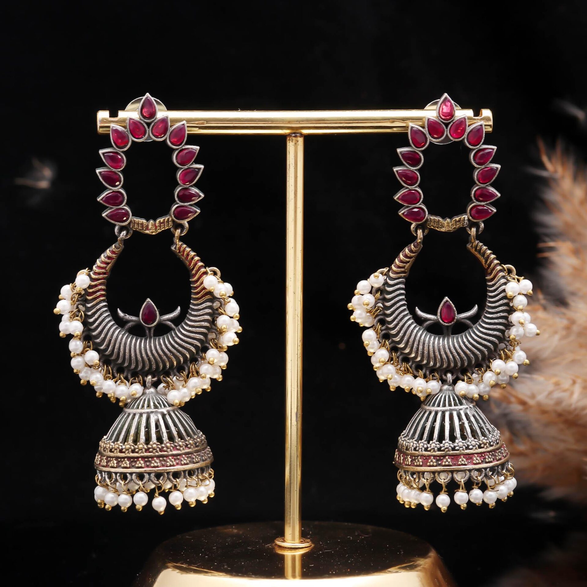 The design features a prominent Chandbali (Crescent Moon) motif in a dark, antique silver-tone finish with ribbed detailing. The top of the earring forms a bold half-circle adorned with brilliant marquise-cut Ruby (or magenta) stones. The crescent itself is bordered with delicate faux pearl drops that create a lovely halo effect. Suspended beneath is a classic, ridged Jhumka dome, also finished with a row of pearls. This blend of metal tones and jewel colors creates a truly luxurious and eye-catching accessory perfect for festive events and weddings.