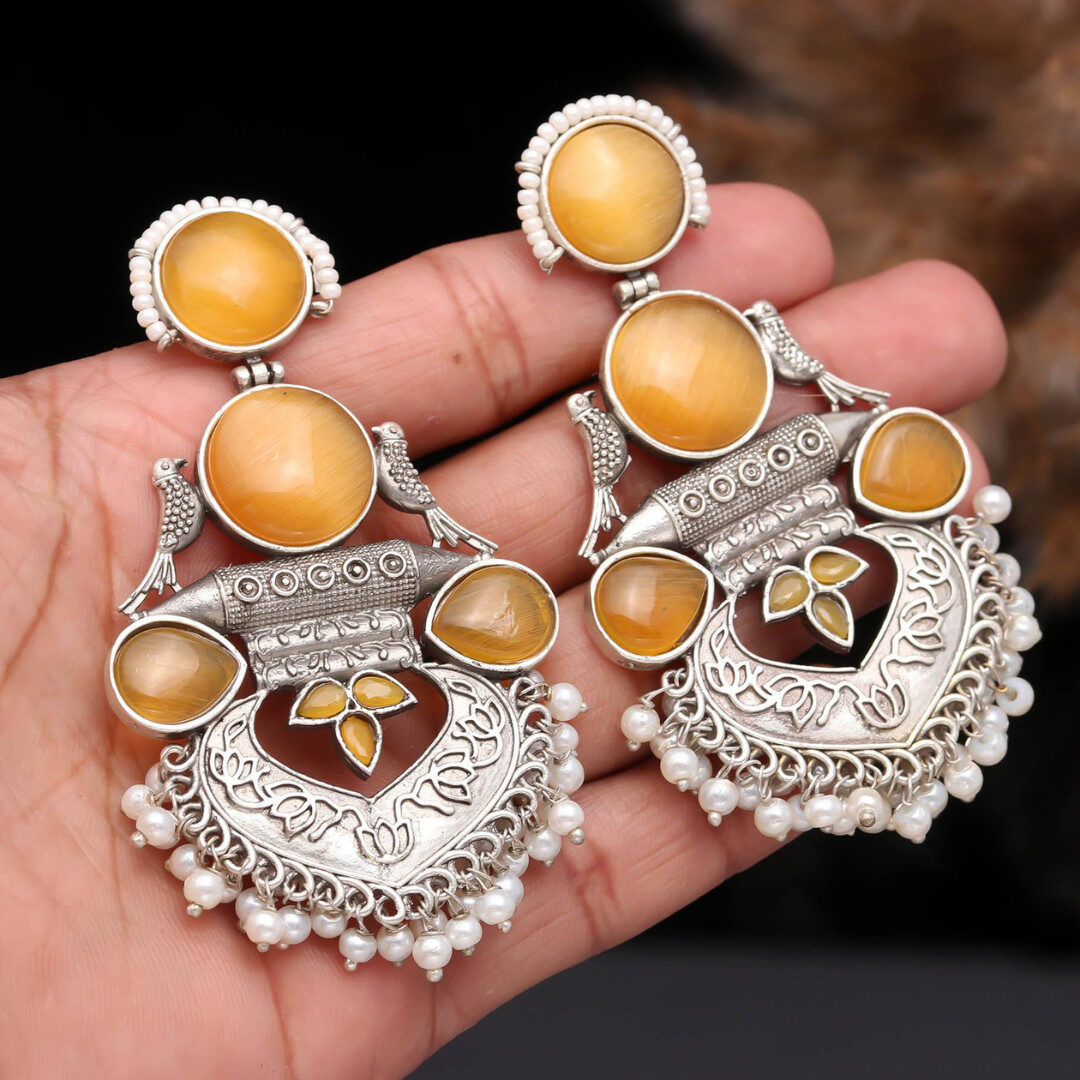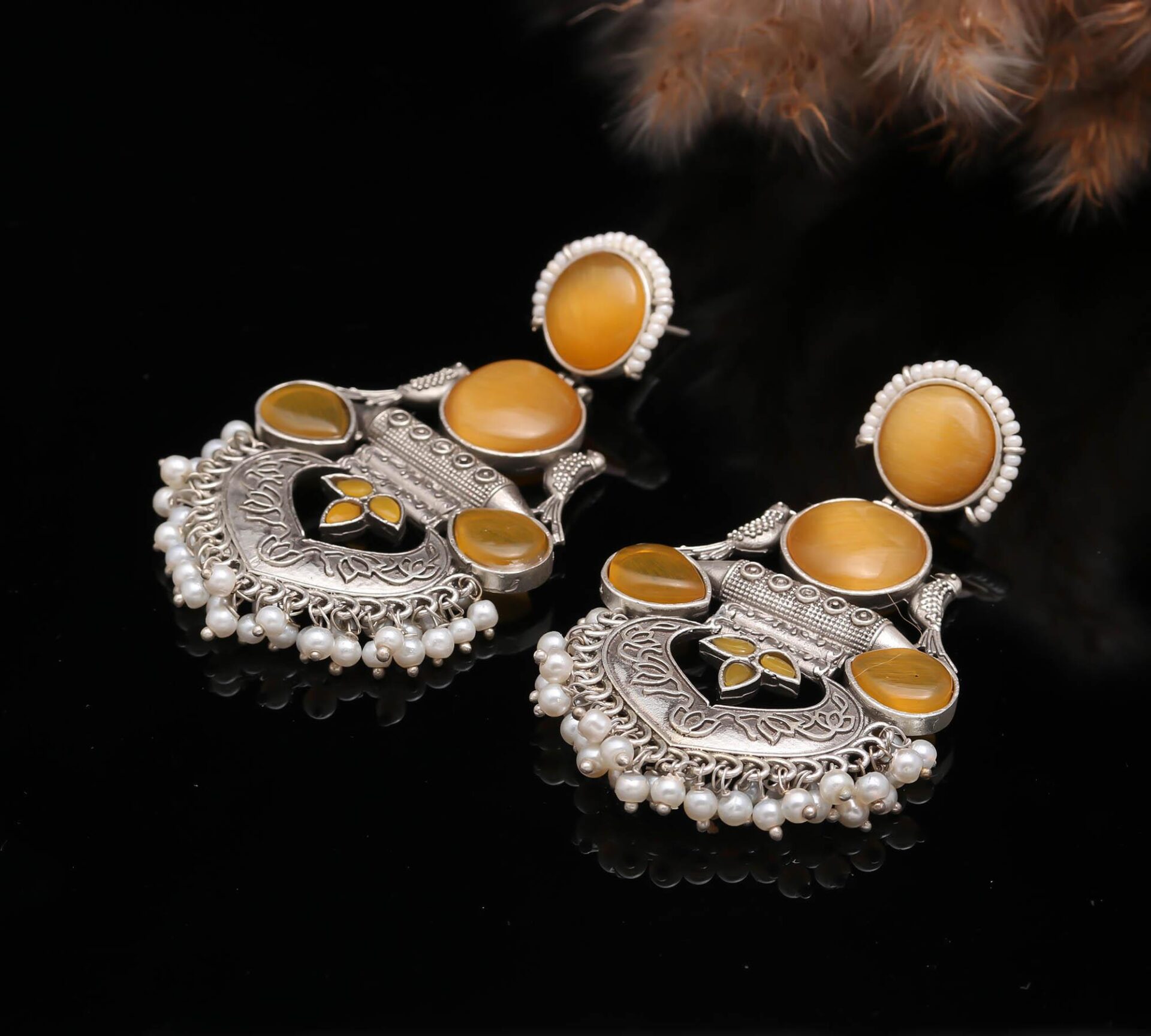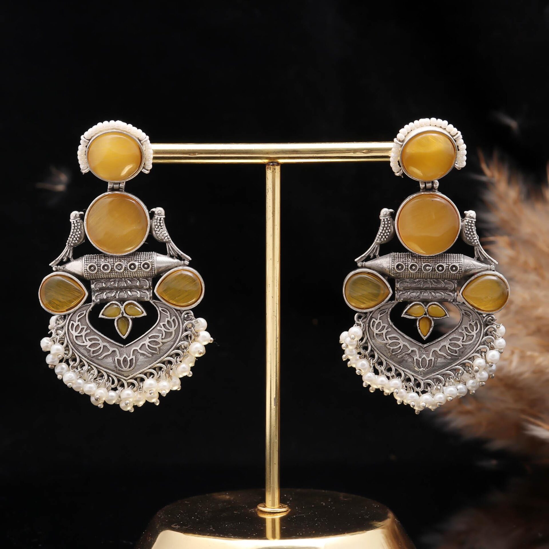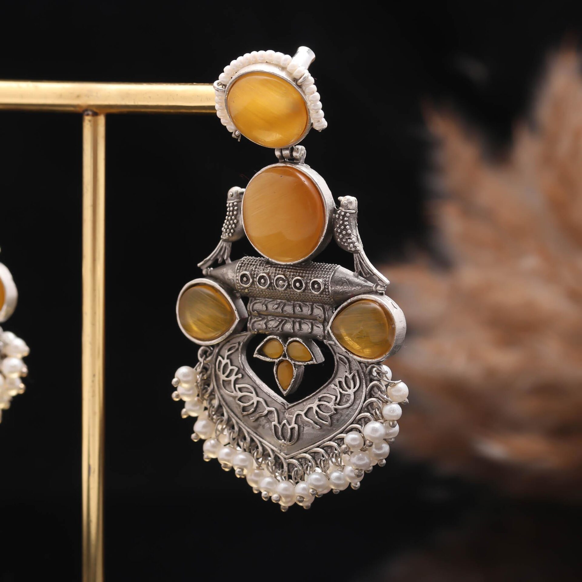 The Saazish Victory Earrings are a dramatic, vibrant statement accessory, showcasing a bold combination of colorful cabochon stones and intricate oxidized metalwork.
